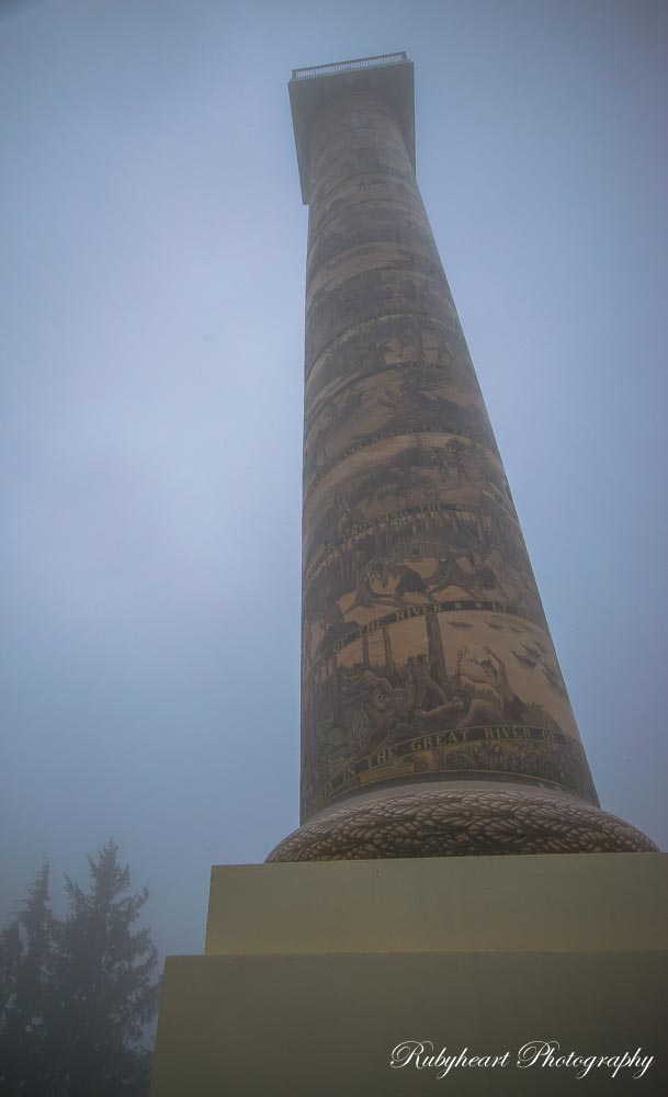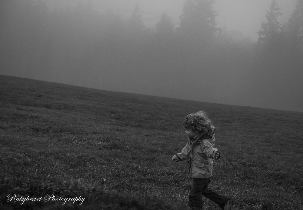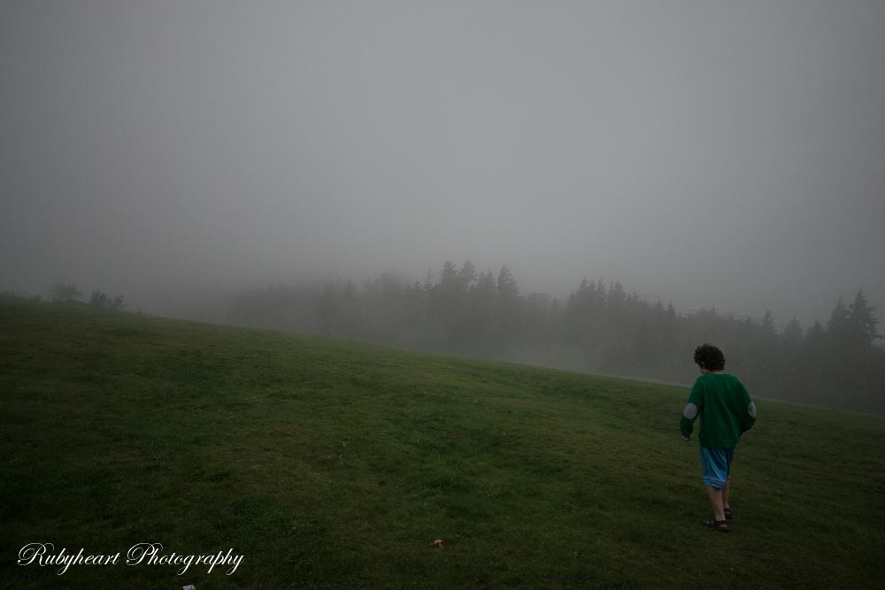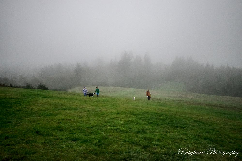 After photographing the Astoria-Megler Bridge, we drove to the Astoria Column. We had no expectations of a view. The column itself was hidden in a thick fog. There was a grassy hill that looked like it was out of a story book. My youngest tested the waters and explored it a little bit so decided to try to capture her. My husband left to pay for the parking. While I was changing my lens, she decided to bolt down the hill. Who could blame her? Those hills are a magic rolling/running down magnet. I am nursing a possibly broken toe and I could not run after her and she would not come when I called her back, so my kids, and then husband ran after her. She got pretty far quickly as you can see in the photographs.